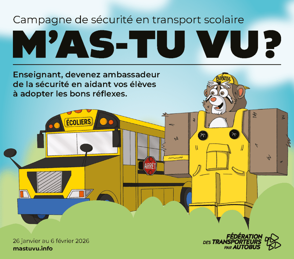 La Fédération des transporteurs par autobus (FTA) tient sa semaine de sécurité en transport scolaire du 26 janvier au 6 février 2026.