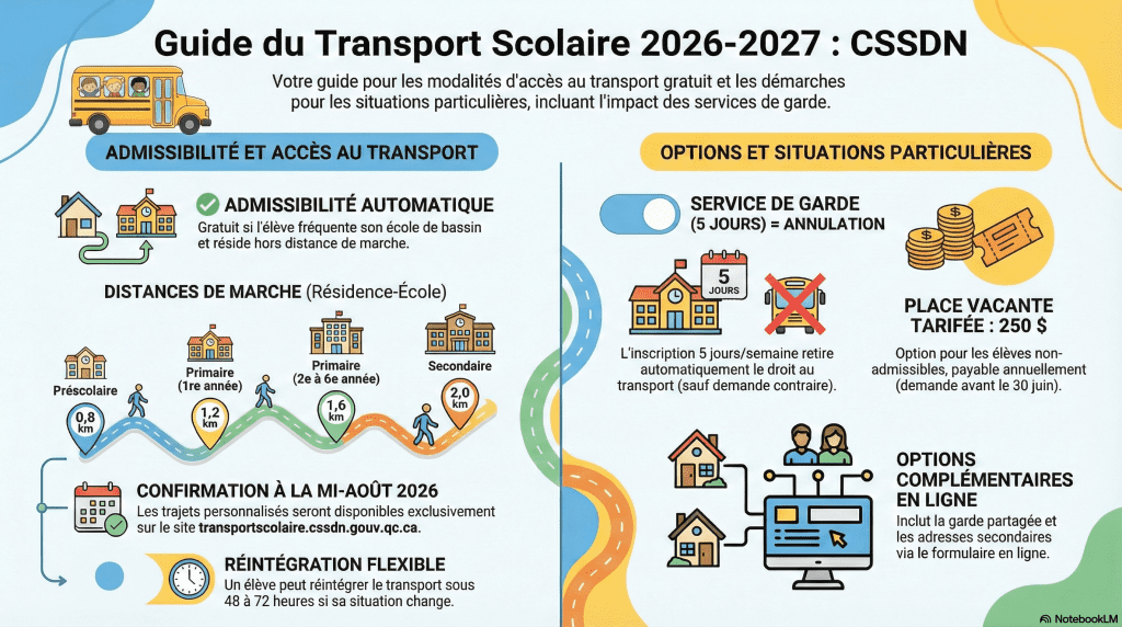 Les confirmations de transport personnalisées sont disponibles exclusivement sur le site internet du CSSDN à partir de la mi-août de chaque année. Prenez note que toute modification au transport vous sera partagée par courriel.