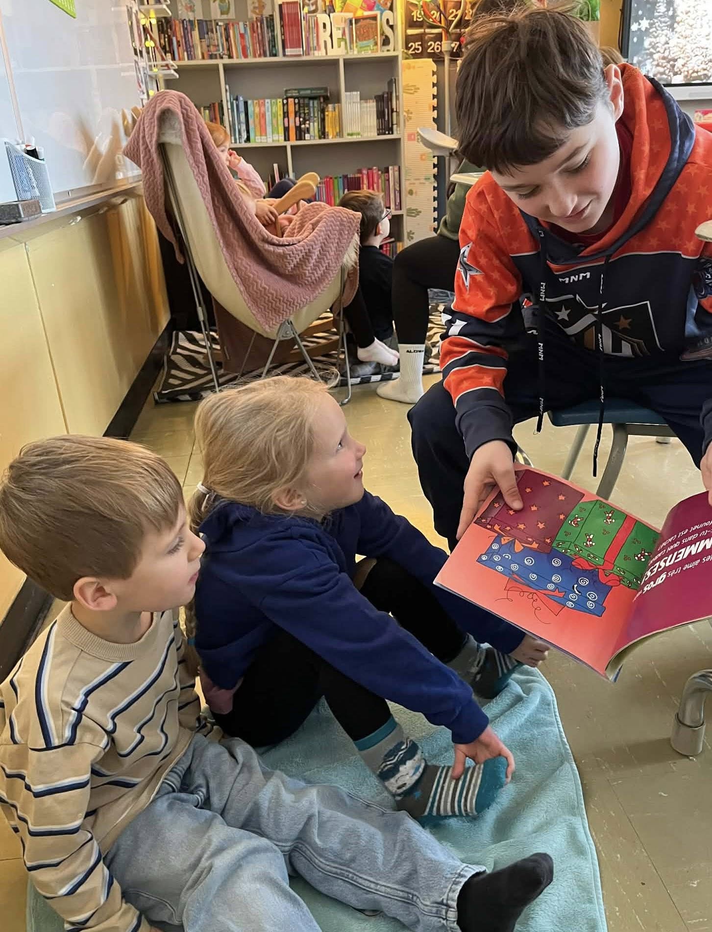 Les élèves ont également accueilli en classe des enfants de 4 et 5 ans des deux groupes du CPE L’Amhirondelle (pavillon de la Couvée). Ensemble, ils ont partagé le plaisir de lire et vécu un moment de lecture de qualité. Les élèves ont ainsi pratiqué la lecture à voix haute, en mettant en valeur la prosodie (intonation, rythme, fluidité), tout en transmettant leur amour des livres aux plus jeunes.