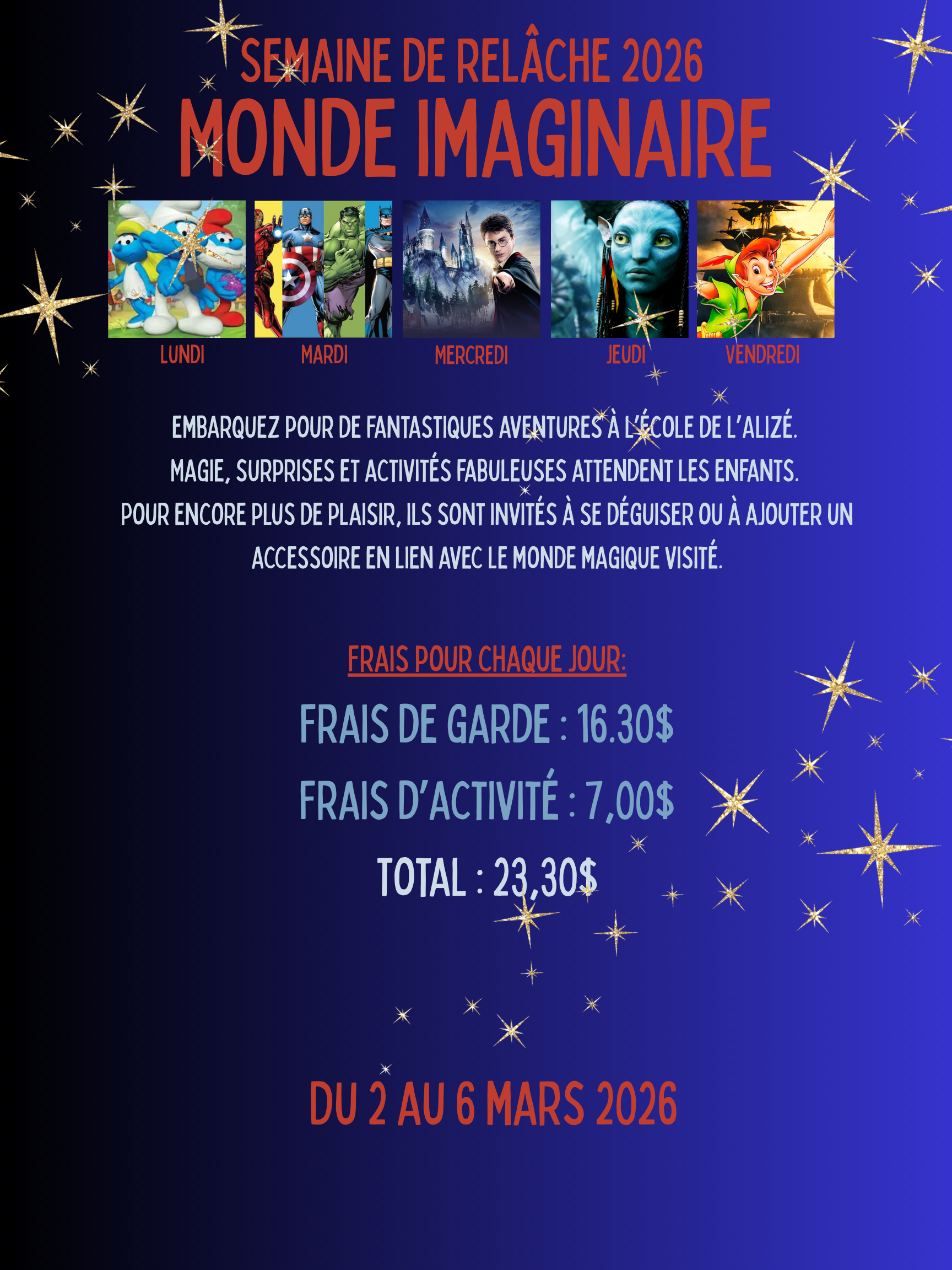 Le ratio en service de garde (1 éducatrice pour 20 enfants) et la sécurité nous obligent, à l’occasion, à prendre une telle décision. Le service de garde est ouvert lors de la semaine de relâche indiquée au calendrier scolaire annuel en vigueur. Le formulaire d’inscription sera disponible en janvier.
