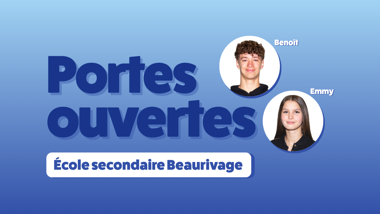 En savoir plus : Portes ouvertes de l’école secondaire Beaurivage – 8 octobre 2025, 18 h 30 à 20 h 30Les portes ouvertes de l’école secondaire Beaurivage auront lieu le mercredi 8 octobre 2025, de 18 h 30 à 20 h 30! Venez en grand nombre, notre école est déjà prête à vous accueillir! 😉