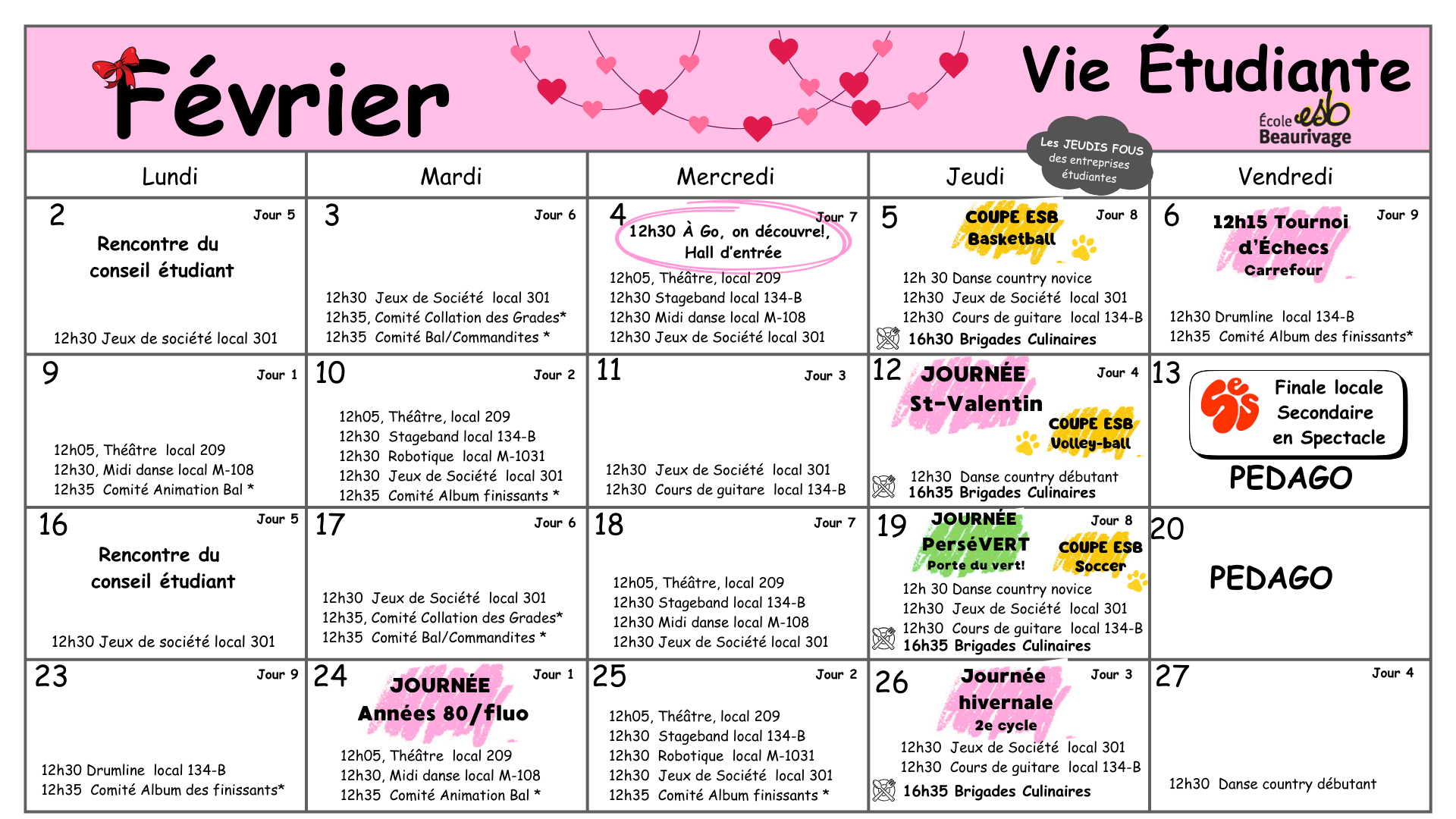 Tout au long de l’année, différentes activités sont organisées selon différents thèmes : Halloween, Noël, St-Valentin, journée country, etc.