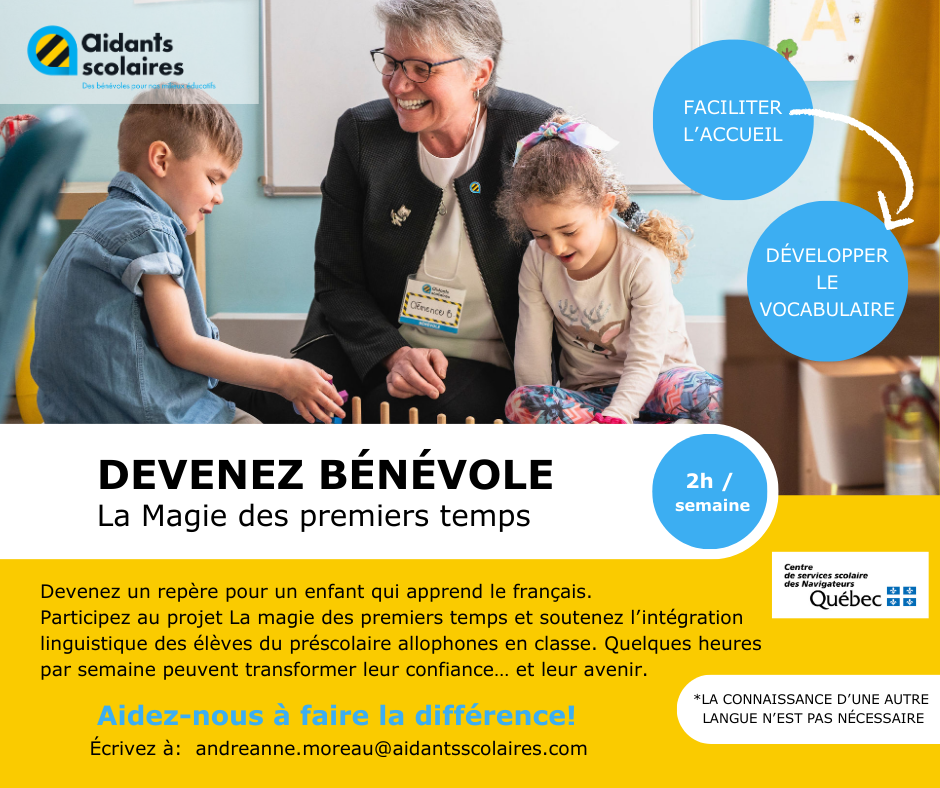 Ce projet de bénévolat vise à soutenir l’intégration linguistique et culturelle des enfants allophones inscrits au préscolaire 5 ans dans les écoles du Centre de services scolaire des Navigateurs, en leur offrant un environnement encore plus riche en interactions, en soutien et en bienveillance.