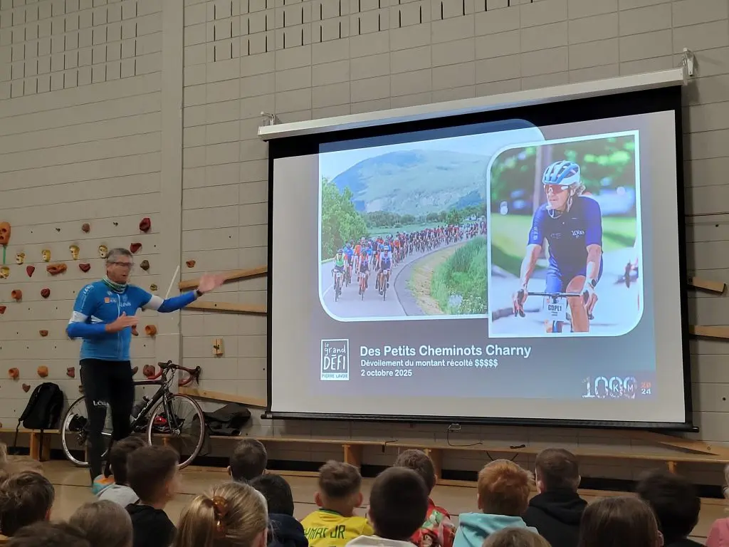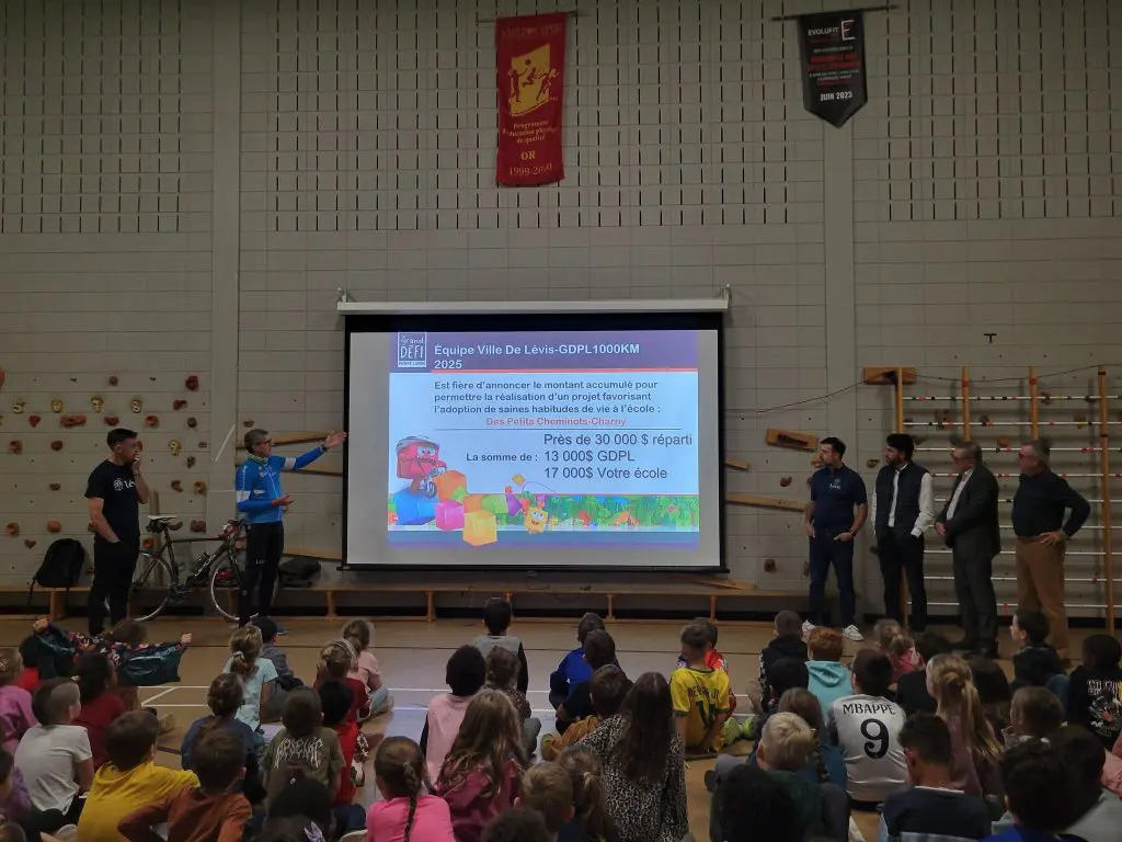 Les élèves et les membres du personnel de l’école des Petits-Cheminots ont eu l’honneur d’accueillir les membres de l’équipe ayant participé au 1000 km du Grand défi Pierre Lavoie, accompagnés de M. Gilles Lehouillier, maire de Lévis, ainsi que du Président de la Caisse populaire de la Chaudière, M. Christian Giroux, le 2 octobre dernier.