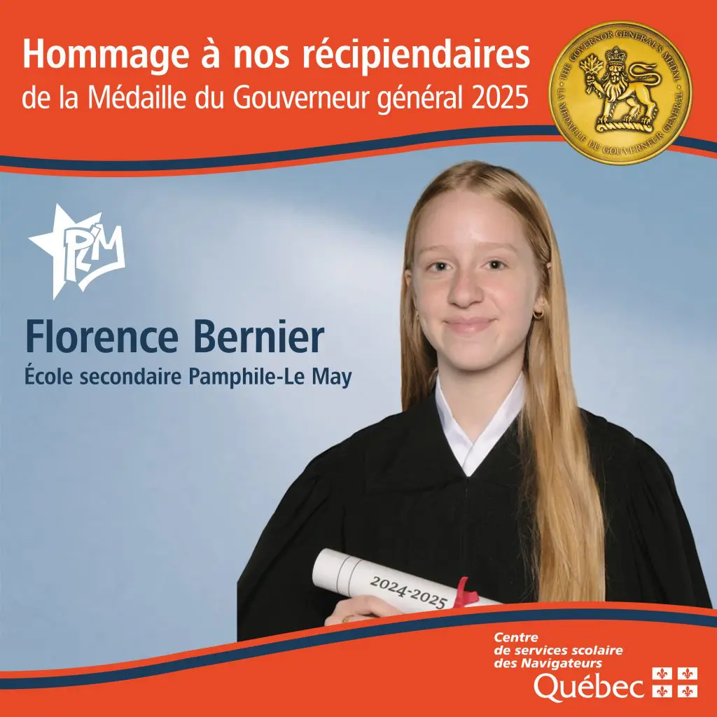 L’école secondaire Pamphile-Le May est fière de mettre en lumière une élève exceptionnelle, une jeune femme dont le parcours incarne à la fois la rigueur intellectuelle, la persévérance et la détermination : Florence Bernier.
