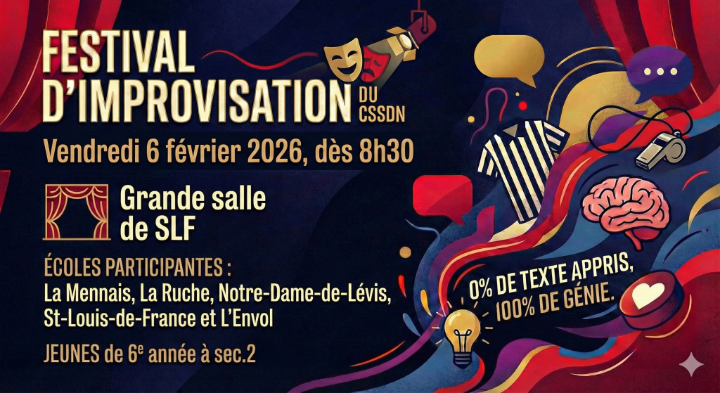 La passion pour l’improvisation ne se dément pas et elle était bien vivante vendredi dernier, le 6 février, à l’école Saint-Louis-de-France à Charny, lors d’un festival réunissant des élèves du primaire et du secondaire du Centre de services scolaire des Navigateurs (CSSDN).