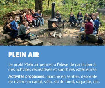 Le profil Plein air permet aux élèves de prendre contact avec la nature en les initiant à diverses activités de plein air.