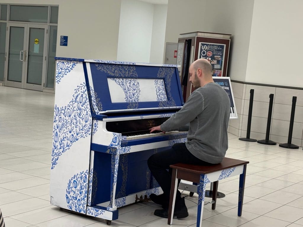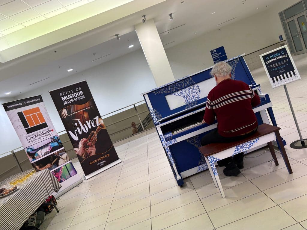 M. Germain Ducharme, pianiste aussi enthousiaste que talentueux, a fait honneur au nouvel instrument si joliment restauré lors du lancement du Piano communautaire aux Galeries Chagnon, le 22 janvier 2026