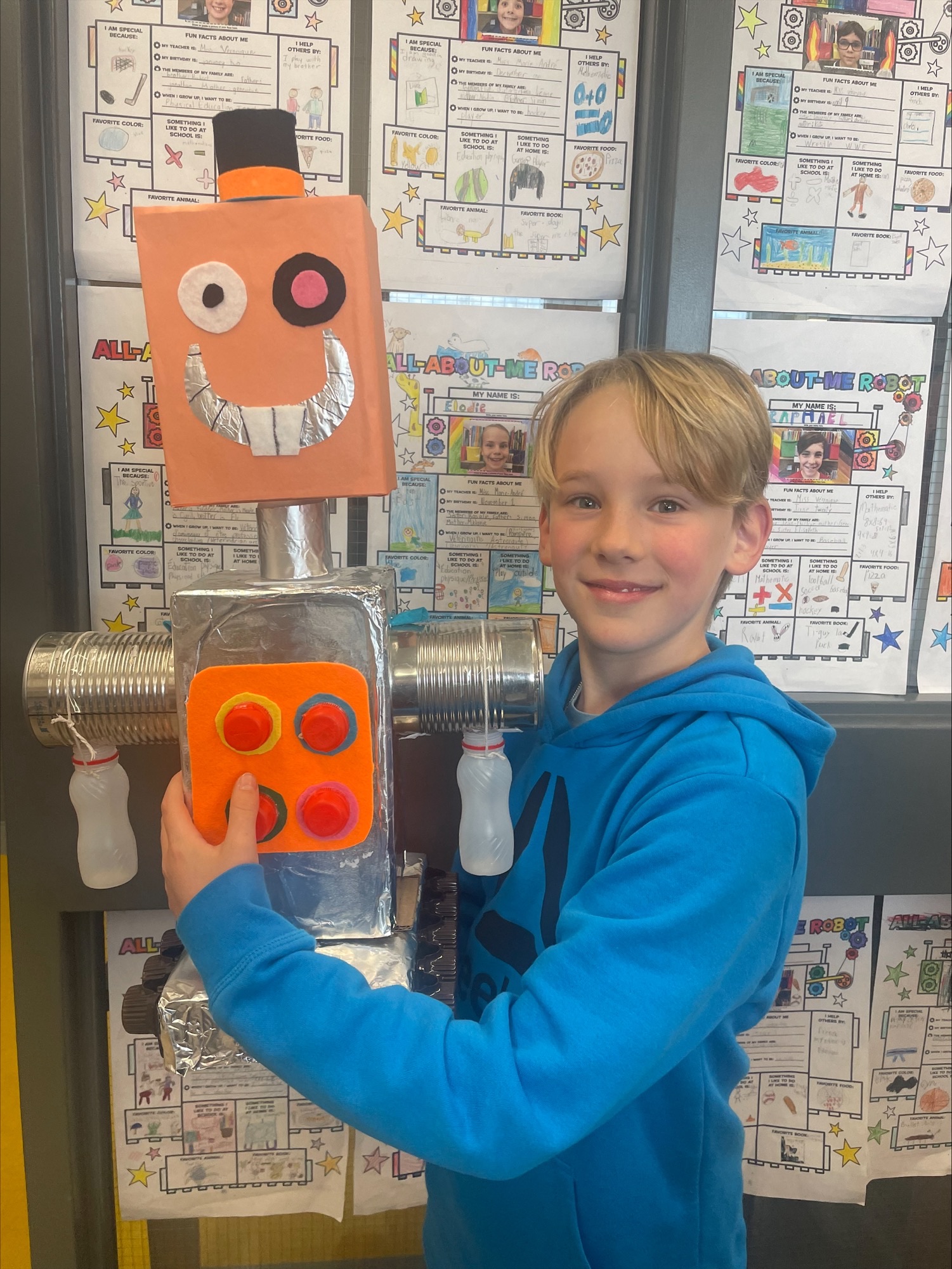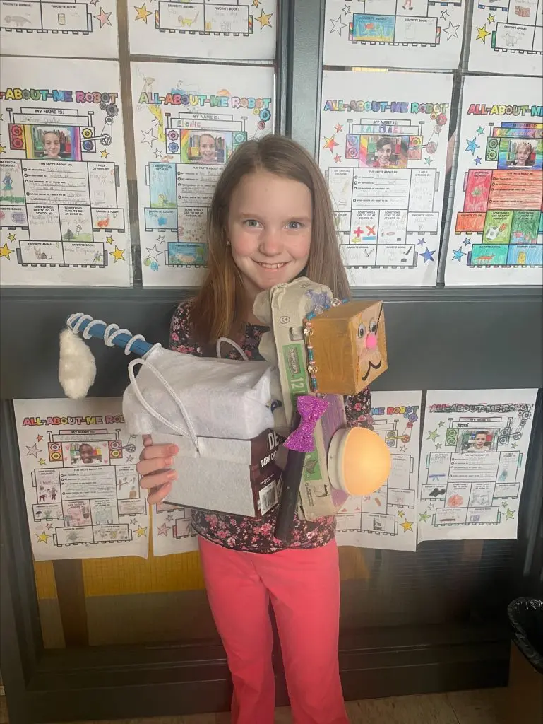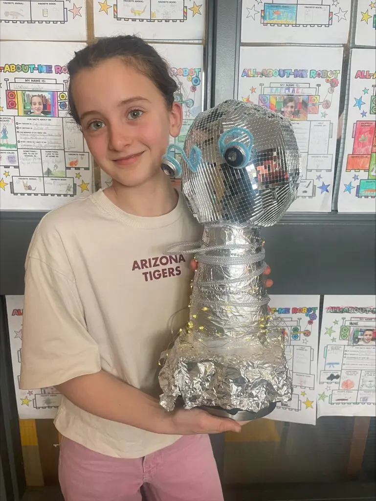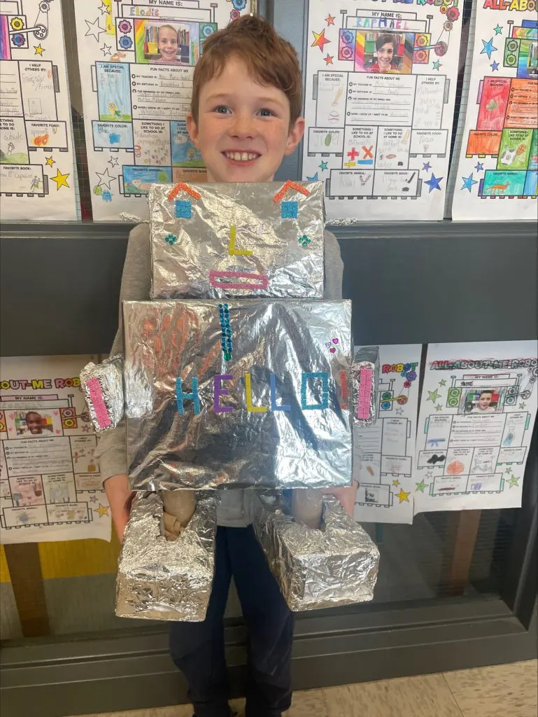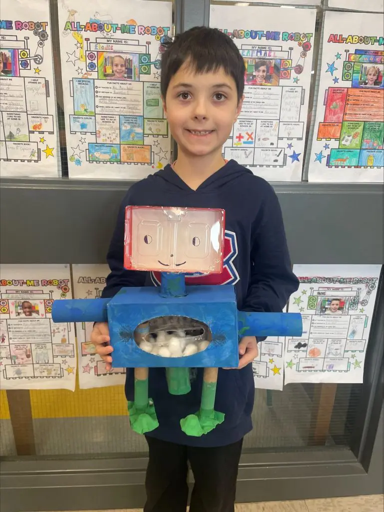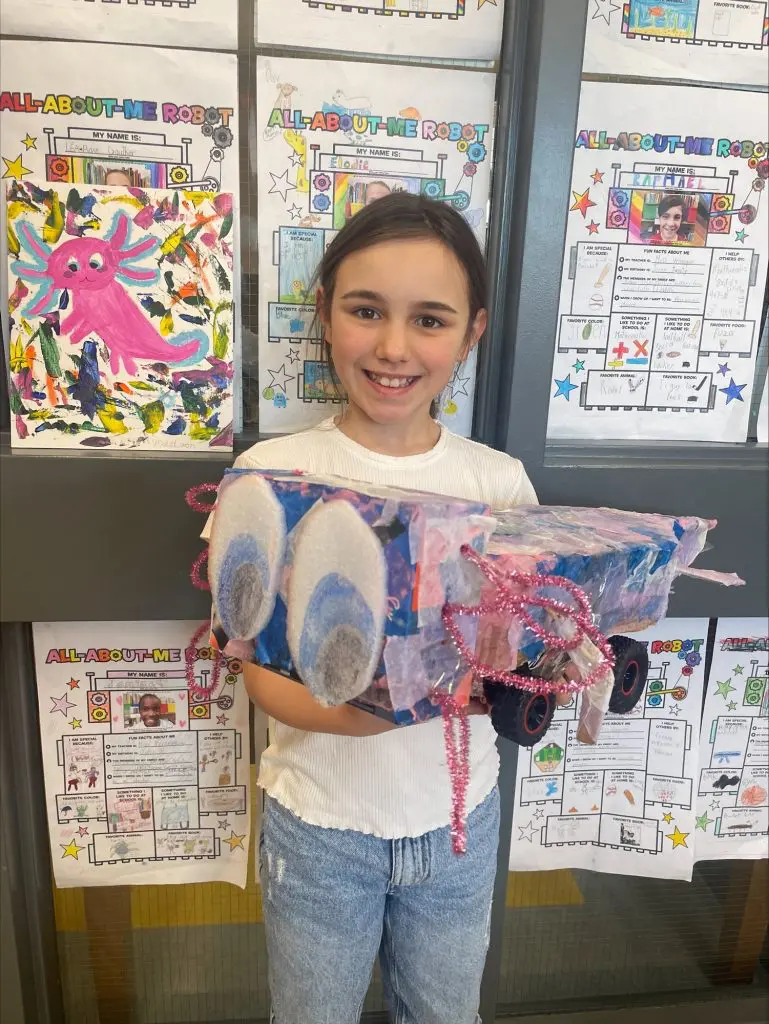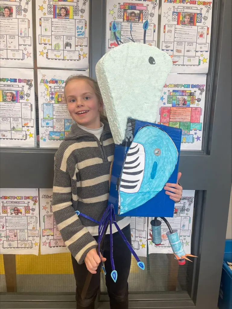 Ce projet vient clore une unité sur les parties du corps. Les élèves ont d’abord imaginé et construit leur robot, puis rédigé un texte descriptif en anglais pour le présenter (exemple : my robot has a long neck. It has two big blue eyes).