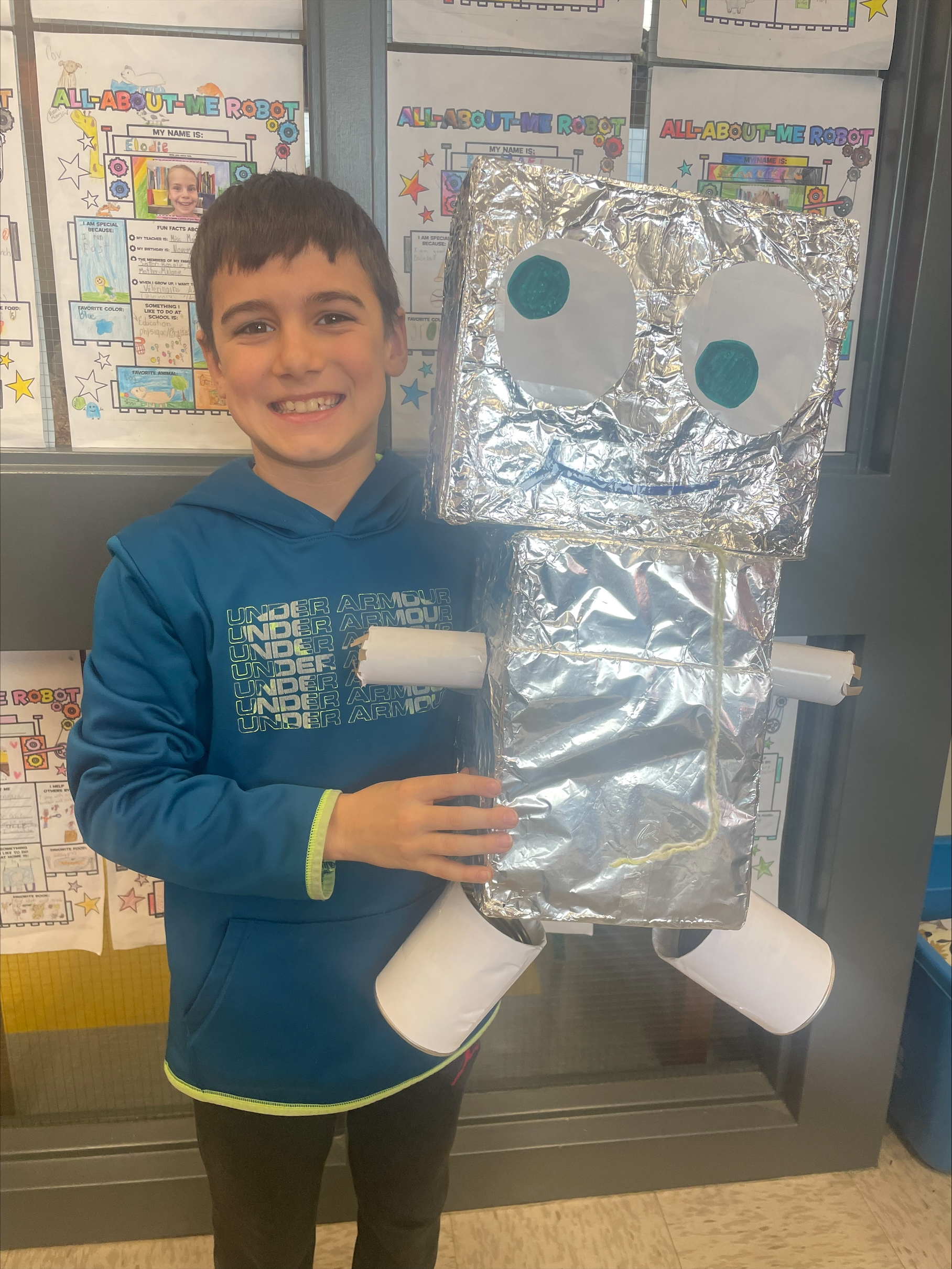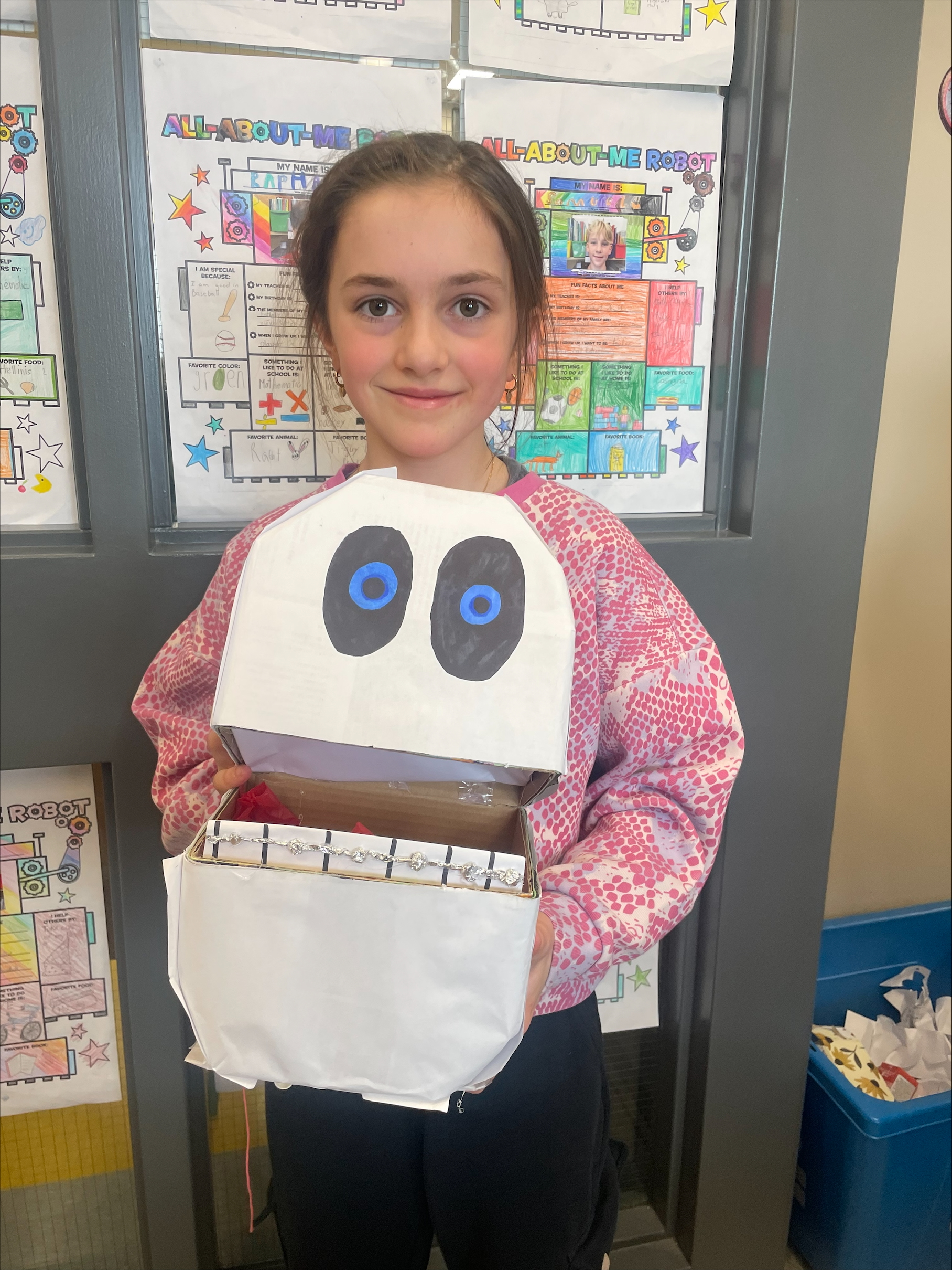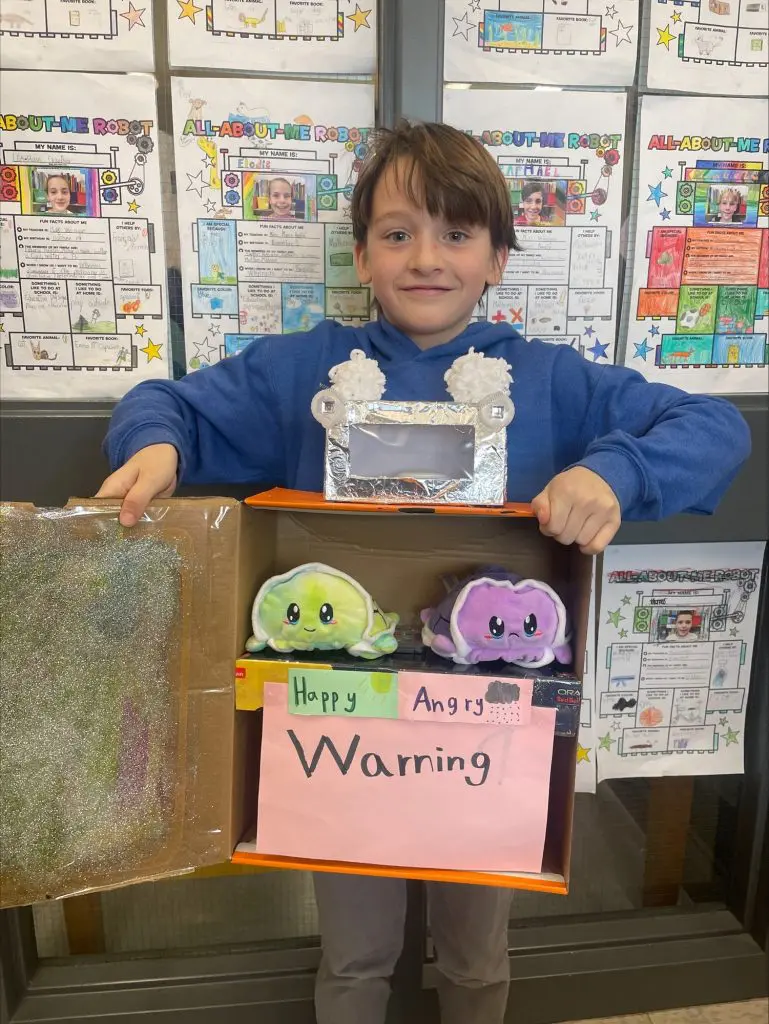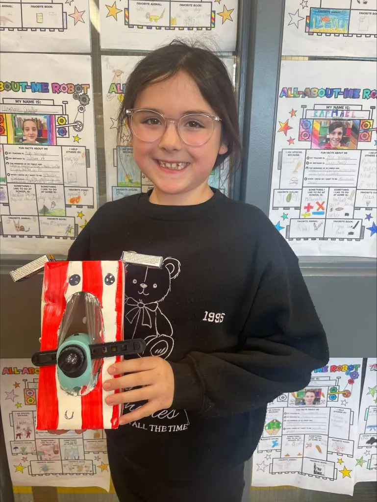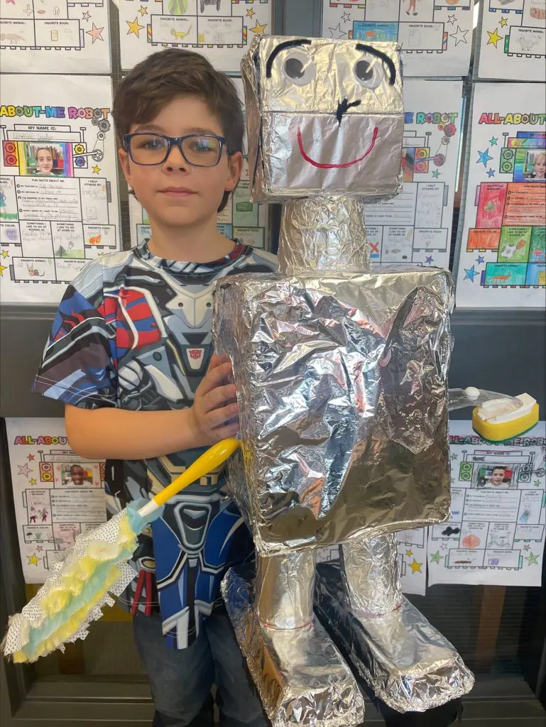 Ce projet vient clore une unité sur les parties du corps. Les élèves ont d’abord imaginé et construit leur robot, puis rédigé un texte descriptif en anglais pour le présenter (exemple : my robot has a long neck. It has two big blue eyes).