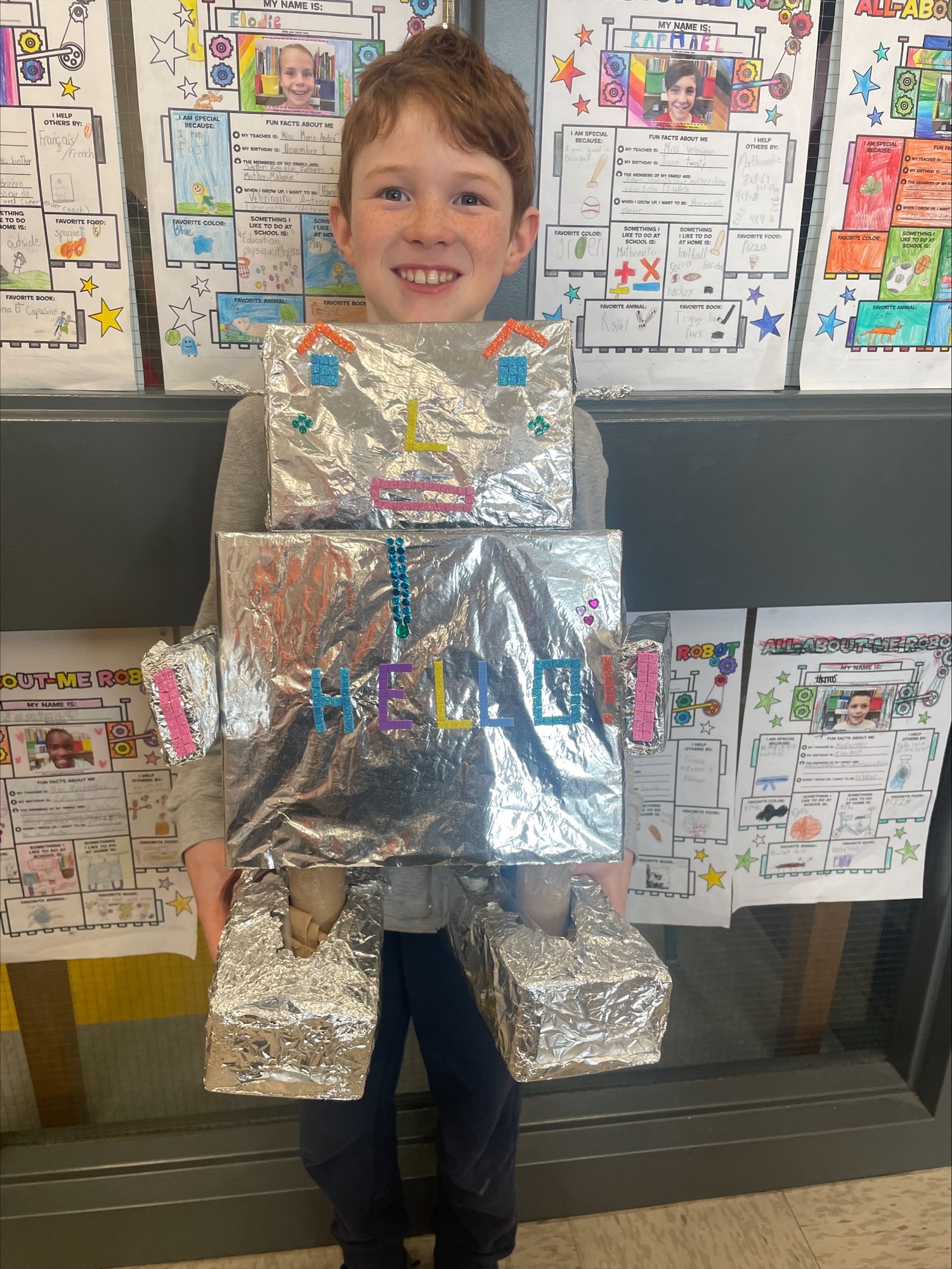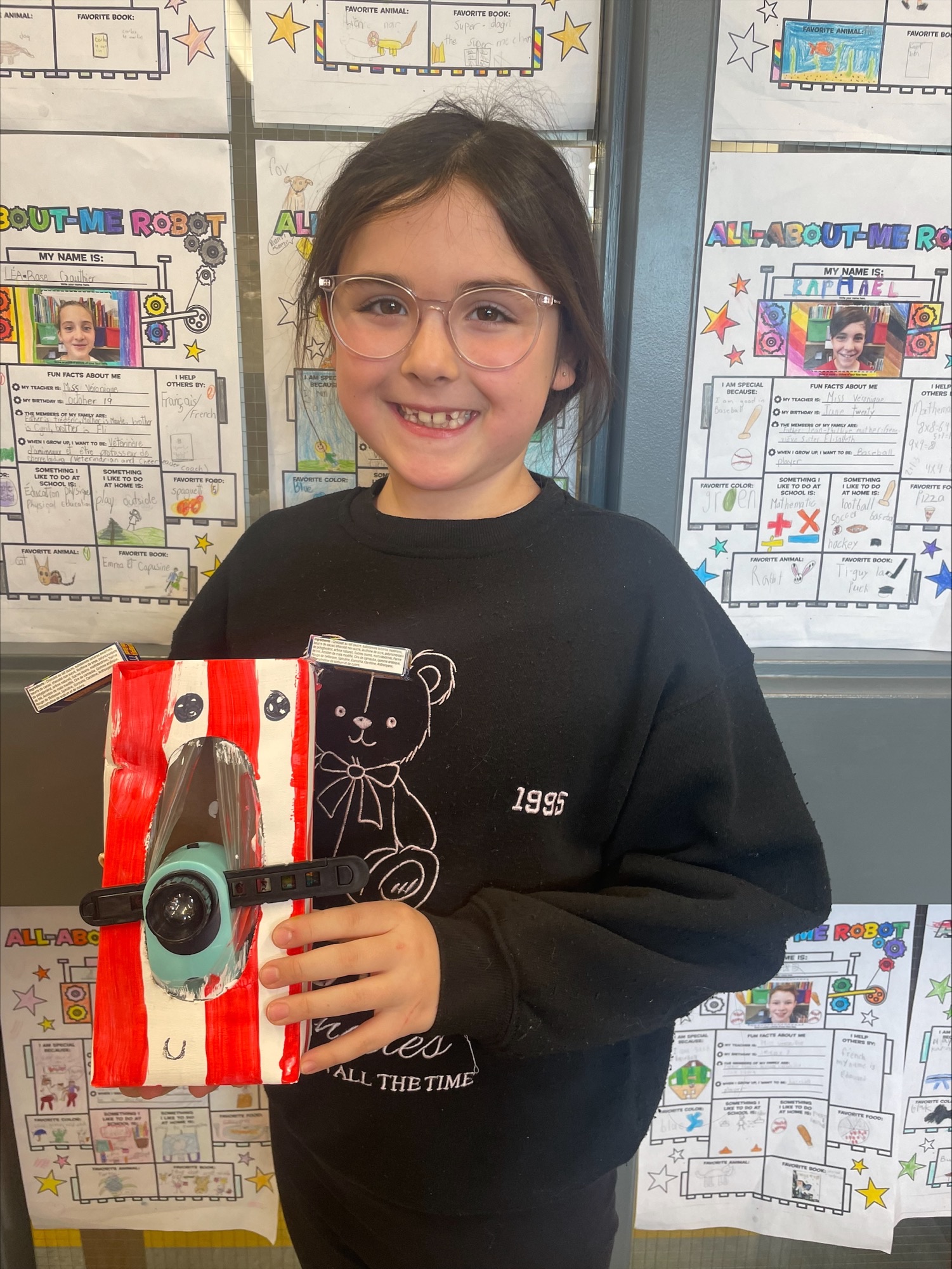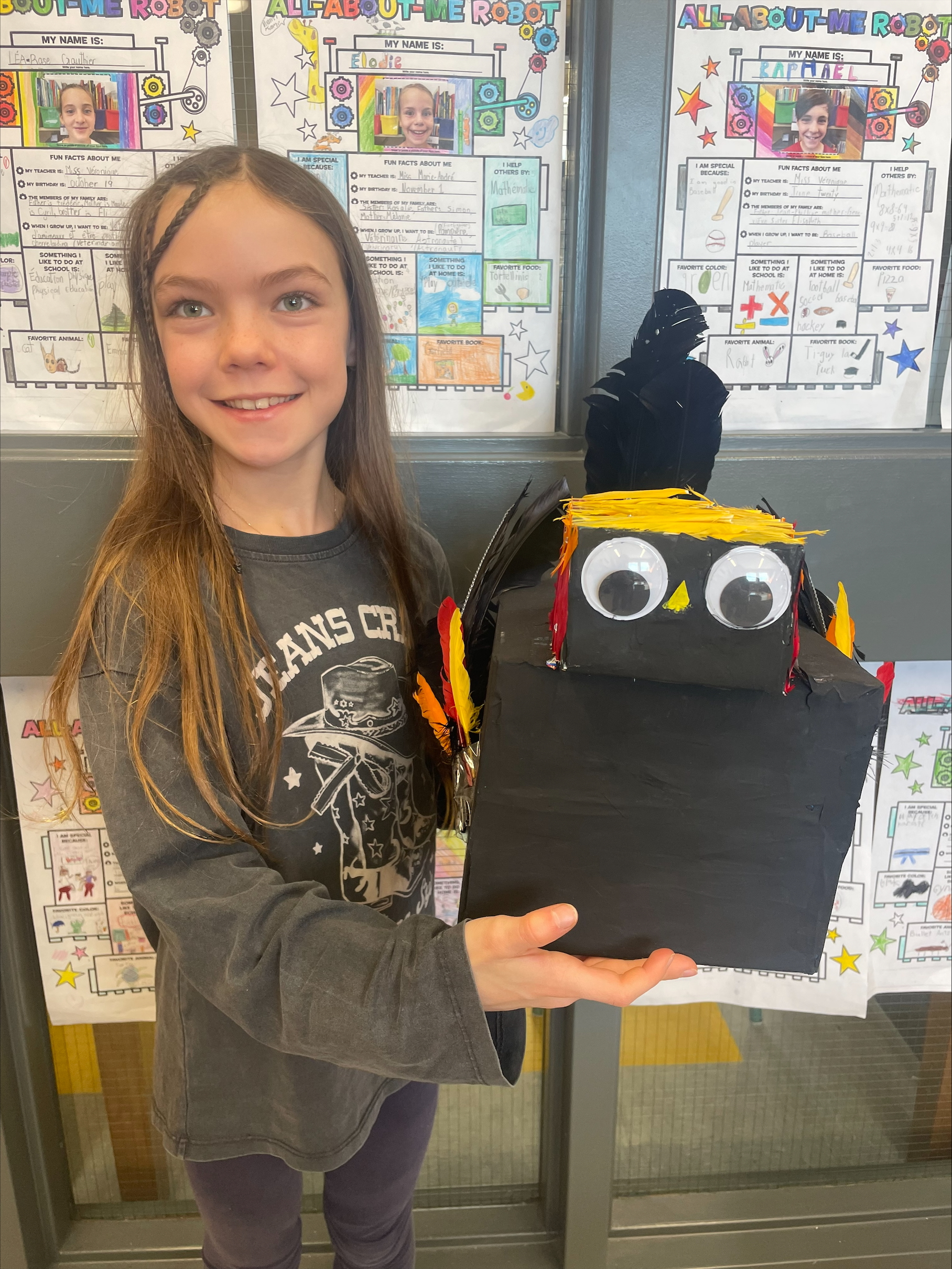 Ensuite, chaque élève a présenté sa création à la classe en expliquant deux utilités, parfois réalistes, parfois farfelues (exemples : my robot can project movies. My robot can do my homework!).