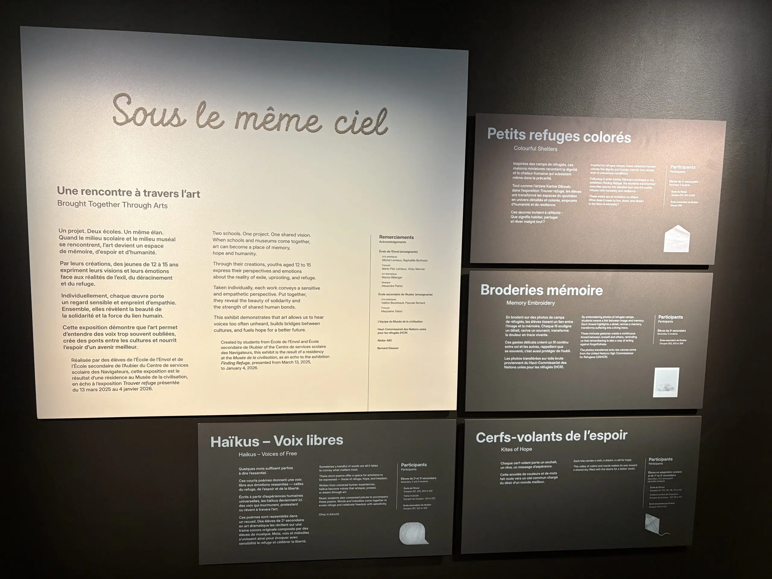 Un projet. Deux écoles. Un même élan qui mène à la rencontre du milieu scolaire et du milieu muséal : l’exposition Sous le même ciel, une rencontre à travers l’art, fruit d’un projet de résidence au Musée de la civilisation, ouvre un espace de mémoire, d’espoir et d’humanité.