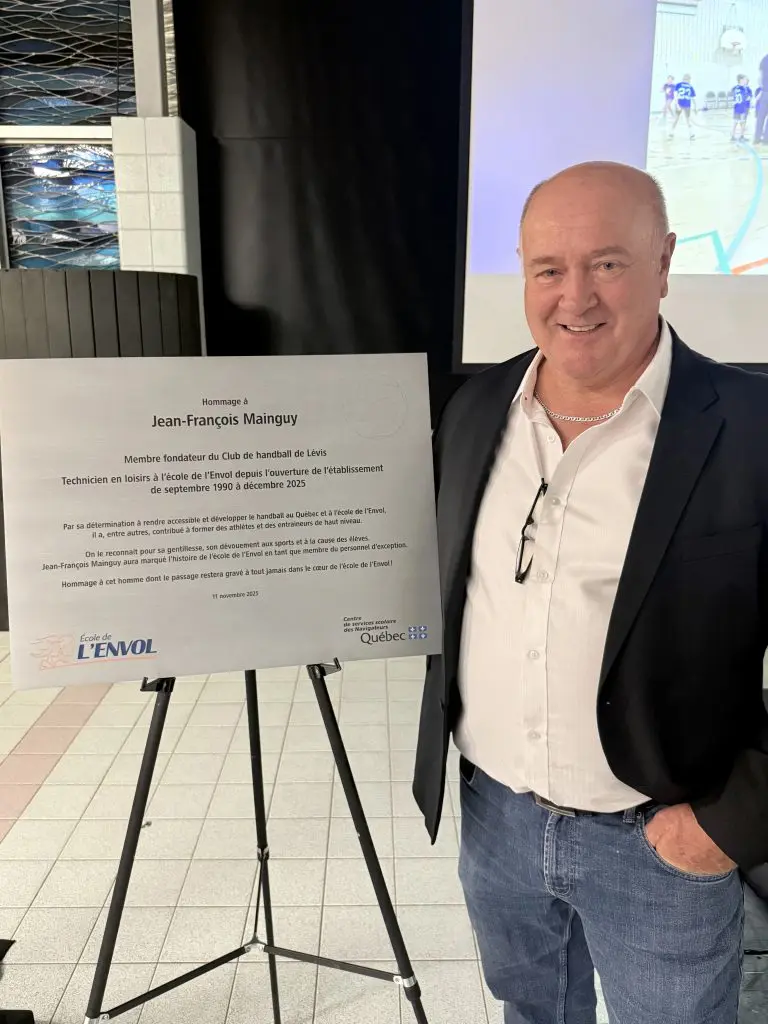 C’est à l’école de l’Envol, où il a œuvré comme technicien en loisirs depuis 1990, que collègues, amis et membres de sa famille se sont réunis, le 11 novembre dernier, pour souligner une carrière marquée par la bienveillance, la créativité, l’engagement et l’amour de l’activité physique. Une plaque en son honneur a été dévoilée et sera installée à l’entrée du gymnase, son « habitat naturel », où l’on continuera, sans doute, de jouer au handball… pour l’éternité !